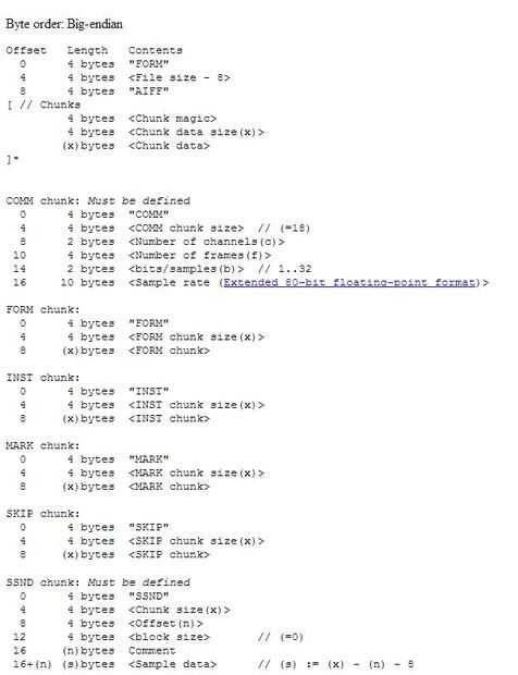 Lectura de un archivo .aiff es extremadamente útil, sobre todo porque es uno de los tipos muy comunes de los archivos de sonido. Por otra parte, leer el archivo .aiff es muy similar a la lectura de cualquier tipo de archivo binario. En otras palabras, como ustedes saben el formato (el formato .aiff archivos puede verse en la foto principal de arriba), puede leer ficheros binarios utilizando la misma lógica que se utiliza en .aiff archivos.
