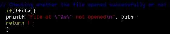Nota: "fopen" devolverá un valor distinto de cero si el archivo se abre correctamente. Por lo tanto, puede utilizar un if instrucción para comprobar si el archivo realmente está abierto o no (véase la imagen inferior).