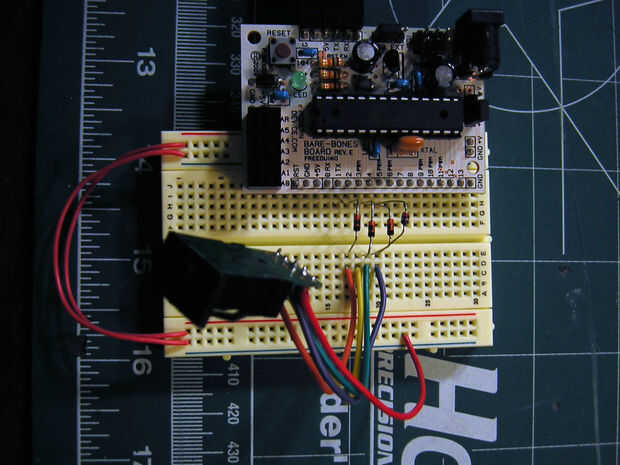 Recoger cuatro puertos en el MCU que son libres y configuración como entradas. Elegí PD [2..5] en mi setup, pero no importa que usted elija, sólo tener cuidado de usar PD [0..1] Si usted está planeando utilizar comunicación arte U (S) como los pines están reservados generalmente para que. Estoy bastante seguro de Arduino y otros clones mapa los pines 0 y 1 a su puerto USB FTDI, así. Como medida opcional, puede elegir instalar diodos (en las siguientes imágenes la raya está a la derecha). Algunas placas tienen protección pero si juegas alrededor de desnudo chips AVR en juntas probablemente no es un mal hábito. Haces estas cosas después de que hayas olido bastante quema los transistores.