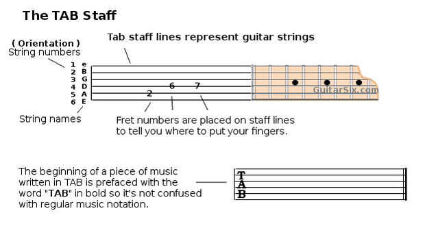 Guitar TAB está escrito en una plantilla que imita las cuerdas de la guitarra. La línea en la parte inferior representa la menor cadena de guitarra (más gruesa) mientras que la línea en la parte superior representa la secuencia más alta (más delgada).