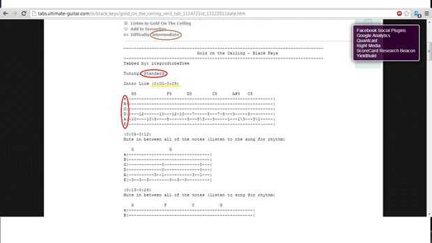 Se muestra en la imagen superior es la disposición estándar para todas las hojas tab de guitarra. Por el círculo marrón destaca el nivel de dificultad de la canción. En nuestro ejemplo, "Gold on the Ceiling" el nivel de dificultad es intermedio. Un círculo rojo es el tuning para esta canción. Mirando la segunda foto le da el funcionamiento abajo de cómo afinar su guitarra. La cuerda más gruesa es la E de baja y luego siguen en este orden de E - A, D, G, B, e. con su sintonizador de afinar la guitarra para esta canción. También subraya en amarilla es la hora de inicio de la canción, se trata de plazos en la canción debería estar jugando en esta sección.