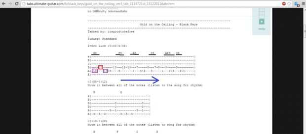 Esta es la parte más difícil del aprendizaje fichas-entendimiento cómo ficha se traduce en notas en la guitarra. Cada número de la ficha representa una nota en la guitarra. Cada cadena tiene su propia fila de la ficha, de fondo a la tapa se lee Guitar. Fichas leer izquierda a derecha para que el primer número de la ficha (también conocido como la primera nota de la guitarra en la canción) es la cadena A, traste 10. El primer número está resaltado en el cuadro púrpura en la primera foto. Este número corresponde a la nota en la guitarra tocada en la segunda foto, también destacada en púrpura. Para reproducir esta nota en la guitarra, presione hacia abajo en la cadena A en el traste 10. Mientras presiona la cuerda, toma la cuerda con la otra mano. Ficha Lee de izquierda a derecha, indicada por la flecha azul, tocar cada nota en orden. Tiempo se basa en el número de líneas de trazos entre cada nota. Más discontinua líneas sin una nota en ellos más la pausa. Estas líneas discontinuas pretenden dar una idea general de la sincronización. Después de completar una línea de pestaña pasemos a la siguiente, como lo hace leyendo un libro y pasar de allí. Encima de las líneas son los acordes de la raíz de la canción. Estos acordes están subrayados con negro. Estos acordes también pueden ser jugados sobre la lengüeta de la guitarra. La clave para aprender guitarra es práctica. Más puede leerlos y trabaja en las canciones mejor se convertirá en rápidamente recogiendo nuevas pestañas.