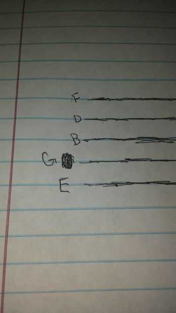 Leer música de la línea de fondo a la línea superior. Una manera fácil de recordar las líneas es cada buen muchacho merece Fudge.