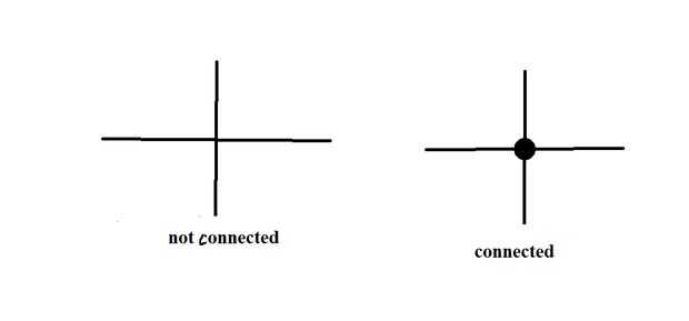Si hay un punto entre dos cables, se conectan los dos cables. De lo contrario no están conectadas.