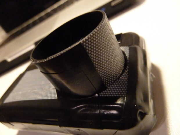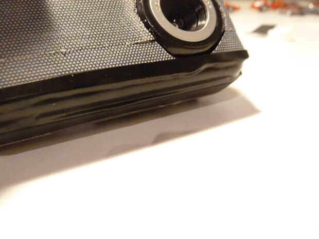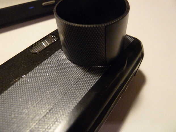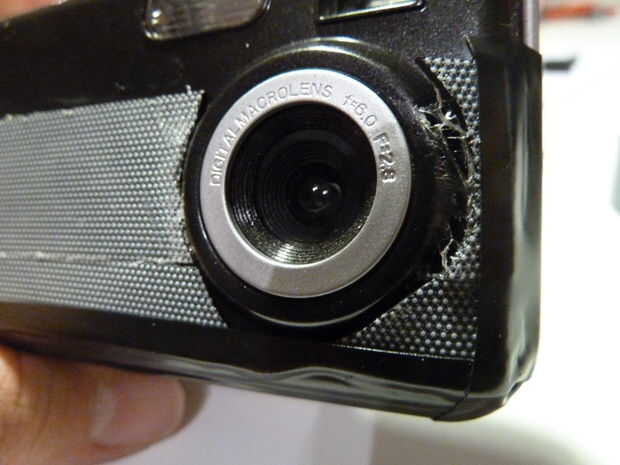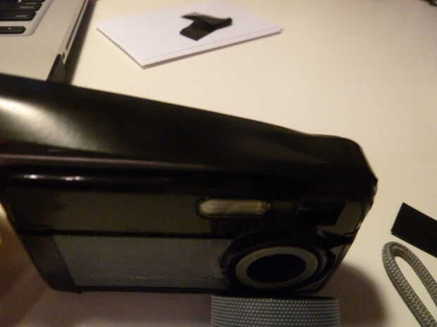 a continuación, tomar la cinta aislante negra y envuélvalo alrededor del perímetro de la cámara, manteniendo la cinta de goma y dando a los bordes un agradable aspecto negro mate. Cuando se pone la cinta en la parte superior de la cámara, frote extra duro para que pueda ver el contorno del botón obturador. Luego, cortar un pequeño trozo de cinta aislante negra y fije el "objetivo" a la cámara.