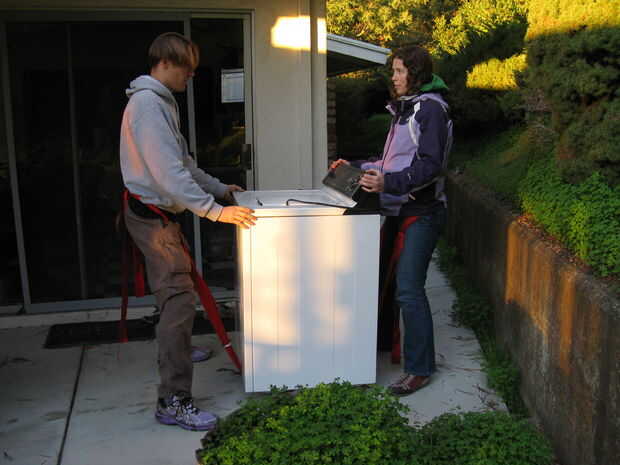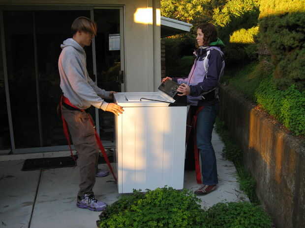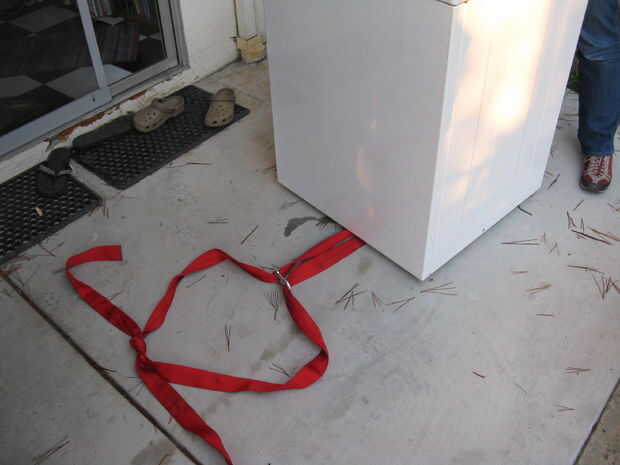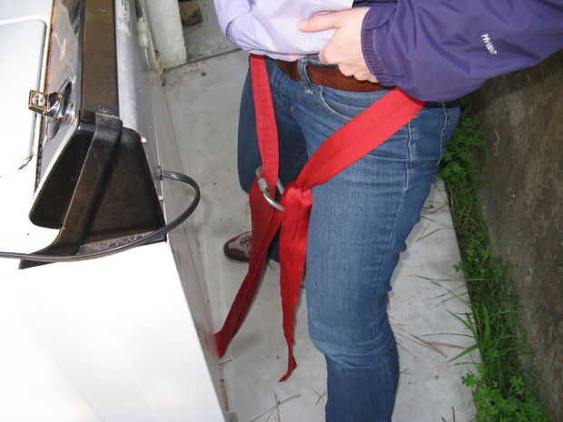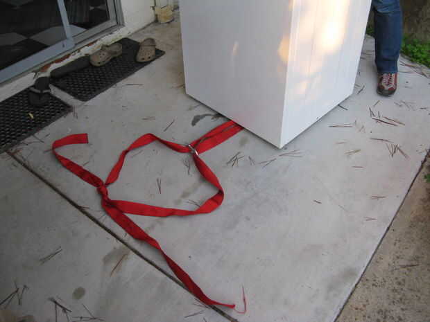 con un pedazo de cinta o cuerda, puede construir un cabestrillo para llevar cargas pesadas sobre sus caderas en lugar de volver. Aquí, estamos usando un bucle de escalada las correas para formar el cabestrillo y mosquetones para mantener la cinta apretada alrededor de nuestra cadera. Lo mismo podría hacerse con una longitud de cuerda atado formando bucles en cada extremo. En el video, puedes ver lo fácil que es para que nosotros de llevar una lavadora vieja, que pesa aproximadamente 150 libras utilizando este mismo método, se llevó fácilmente a una lavadora de 267 libras (según el manual!) dos vuelos de escaleras y alrededor de nuestra casa.