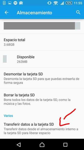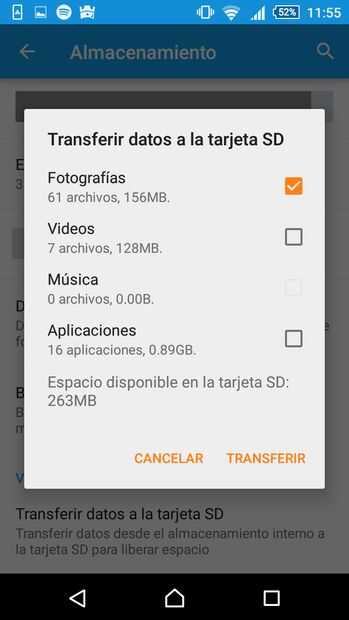 En este paso lo deberemos hacer es seleccionar los datos queremos transferir y darle en transferir luego de esto nuestra memoria interna se aumentará debido a los datos elegimos fueron pasados a la tarjeta SD.