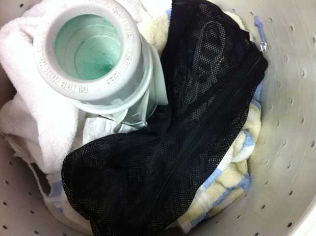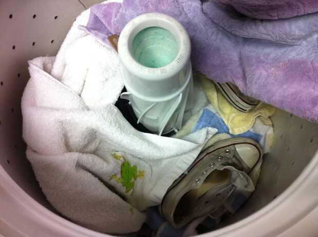 Después, cierre la bolsa y coloque en la lavadora encima de sus toallas. Agregar los zapatos a la carga junto a la bolsa, luego colocar las toallas quedan en la parte superior. Los zapatos y el bolso debe intercalada entre dos capas de toallas. Hacer los ajustes necesarios y tirar la toalla de mano si te gusta.