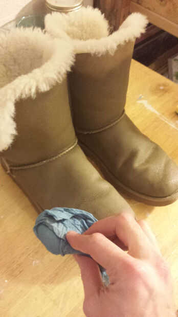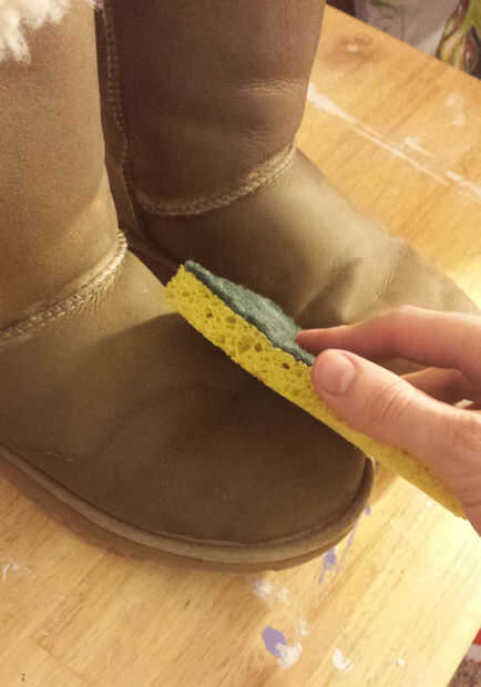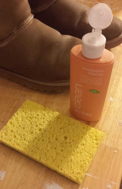 Para limpiar las botas utilicé una zalea limpiador que es básicamente un detergente suave (algunas páginas en internet que me encontré con una solución de vinagre también funcionaría, dijo). Cabe señalar que Ugg vende un kit de limpieza para alrededor $20 que incluye un cepillo, un limpiador, un acondicionador y un sellador (que, en retrospectiva, habría sido útil). El limpiador lo compré era de $5.