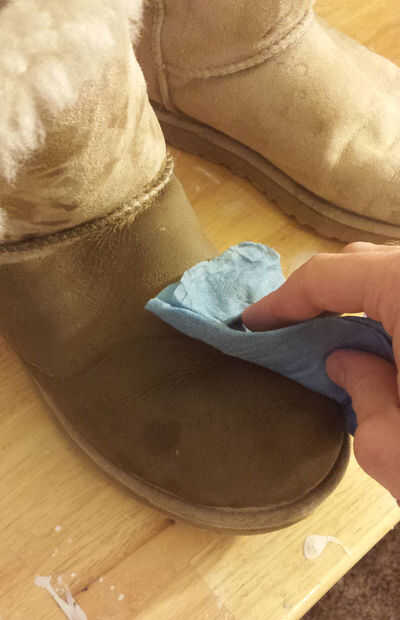 A continuación, aplique la solución de limpieza en una esponja y trabajar en a superficie de la bota, asegurándose de cubrir toda el área y no sólo en las áreas manchadas.