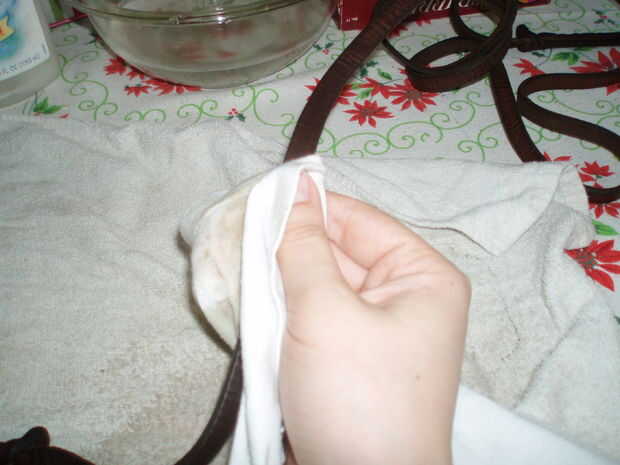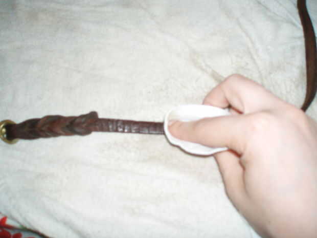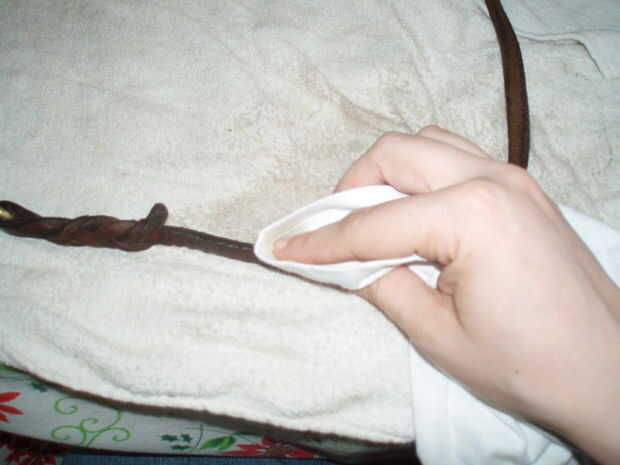 Luego aplicar un poco de aceite en un trapo y frote sobre la piel en pequeños movimientos circulares. Si está trabajando en una correa de correa, arrastre el trapo a lo largo de la longitud del elemento. Asegúrese de que obtener los bordes, así como las áreas planas de cuero. No aplique demasiado aceite. El cuero debe "beberme" el aceite y cualquier exceso se quedarán en la superficie. Esto Limpie con un trapo limpio. Exceso de aceite en el artículo atraerán la suciedad, el contrario exacto de nuestra intención.