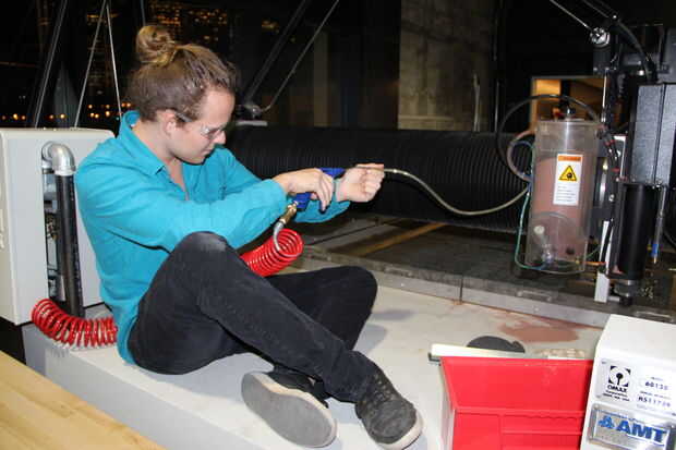 Ahora que tienes los tubos abrasivos desconectados, puede limpiar hacia fuera cualquier agua o abrasivo en el tubo. Tome la pistola de aire comprimido y enchufe en el extremo del tubo del abrasivo en el extremo de la tolva. Tire ligeramente hacia abajo el disparador de gas comprimido para enviar aire a través del tubo. Ayuda si tienes otra persona Sujete el otro extremo del tubo del abrasivo y apuntan hacia la parte posterior del chorro de agua, lejos de cualquier pueblo.