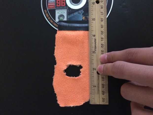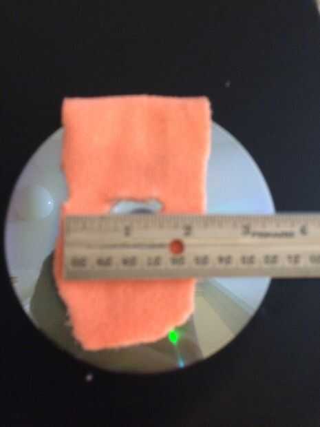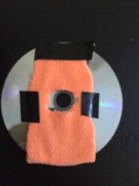 Corte una tira de fibra micro aproximadamente 2,5 pulgadas de ancho y 5 pulgadas de largo. Cortar un agujero en el centro donde en el disco es. Después de esta cinta de la tela es tan seguro. (Asegúrese de cinta los más extremos en el lado gráfico del disco, por lo que la cinta no toque el láser cuando se insertan.