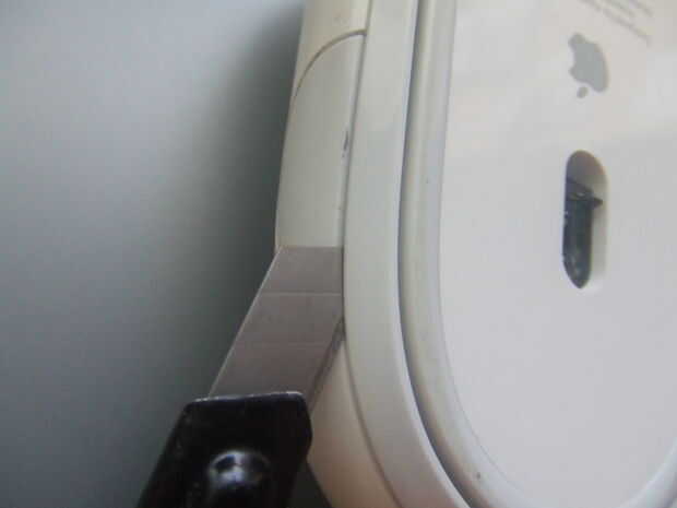 -Con el cuchillo empieza a despegar el anillo de los botones laterales. Es pegado al cuerpo en diferentes puntos, así que cada vez que vas a escuchar un chasquido de la cola suelta.