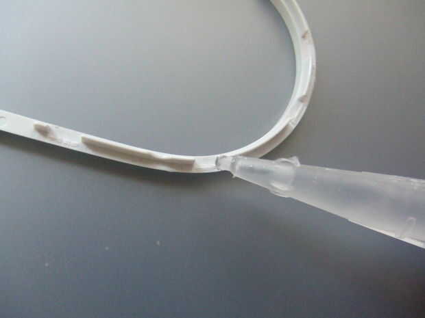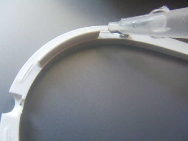 Así que lo que necesita es un par de gotas de pegamento para mantener el anillo fijado. Uno en cada borde diagonal de la base.