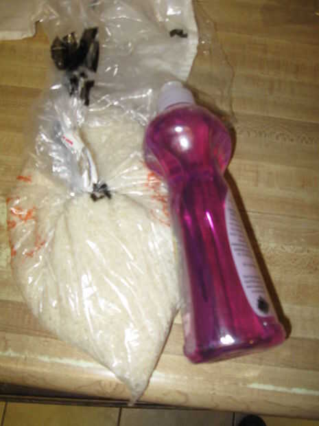 Si no tienes arroz llano en mano, sal gruesa o quinua puede trabajar. No lo he probado para este propósito pero parecen lo suficientemente pequeños y debe ser lo suficientemente abrasivas para hacer el truco.