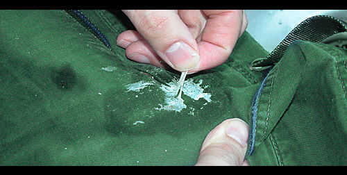 Me pasó, me senté en una goma en un concierto. Pensé que arruinó mis pantalones. Trató de limpiar con un cuchillo, lavar luego... NO USO!