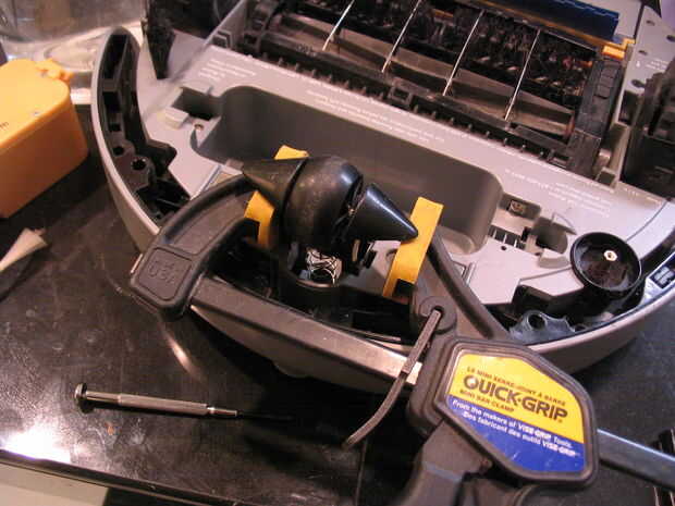 Puesto detrás en el extremo del eje excéntrico y presione el eje en la rueda. Otra vez, usé una sujeción rápida como una prensa (pero sin destornillador ni batería). Una vez que el árbol es a través de la rueda, alinee con el orificio en el brazo no excéntrica y cuidadosamente continúe pulsándolo a través.