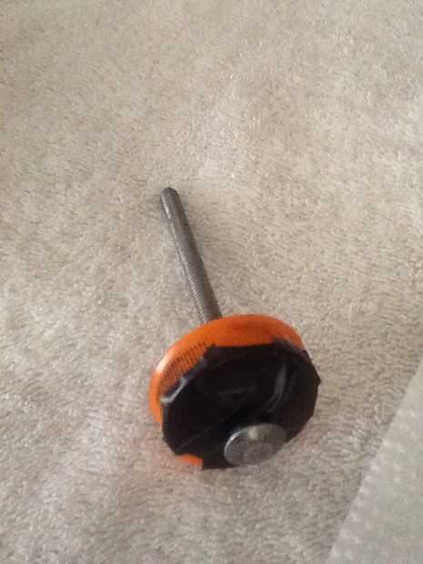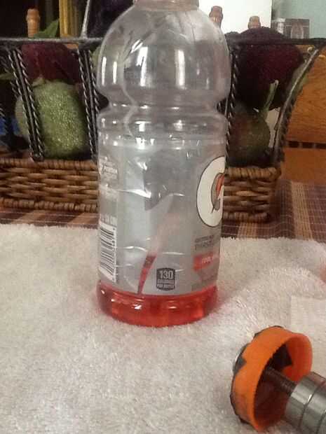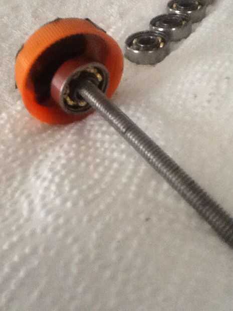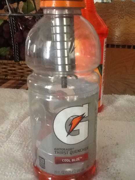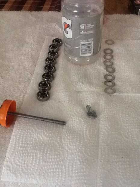 Ahora que sus escudos son de poner en una botella con su disolvente, llene la botella aproximadamente 1/3 de la manera con su solvente, estoy utilizando un desengrasante naranja, sus escudos (anillos metálicos) y rodamientos de la gota en la botella con el solvente. O puedes hacer una más eficaz con un tornillo largo, tuerca y cinta como lo hice. Tu va a agitar la botella cada tan a menudo y dejar sentado boca abajo para que todos los rodamientos de remojan durante al menos cinco minutos. Agite, que sentarse, agitar, que sentarse, agitar, dejar que sentarse, etc.