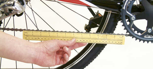 • Tome una regla y medida desde el centro de un perno de enlace. El pin 24 de la línea debe estar exactamente 12 pulgadas aparte del primer pin que usted está midiendo desde. Cada eslabón se hace exactamente media pulgada de largo. Si la cadena está estirada de 1/16 de pulgada o más es hora de empezar a pensar en una nueva cadena.