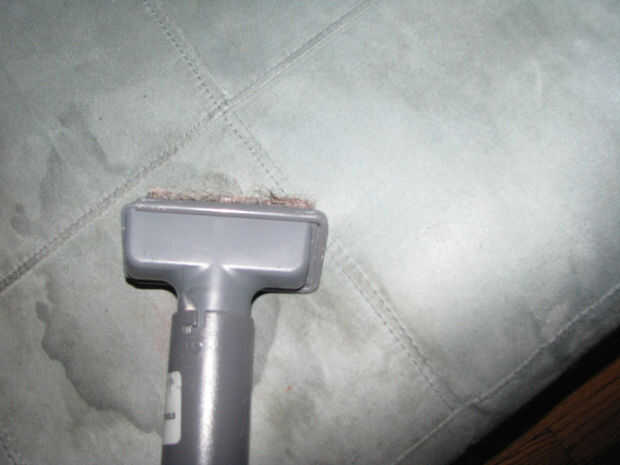 Lo primero, vacío tu sofá.  Usé el cepillo.  Ir sobre el sofá entero. Mientras que el hacerlo buscar las manchas. Noté derrames en mis cojines, restos severo en el brazo y la espalda parecida alguien fue dejando su "Soul Glo"