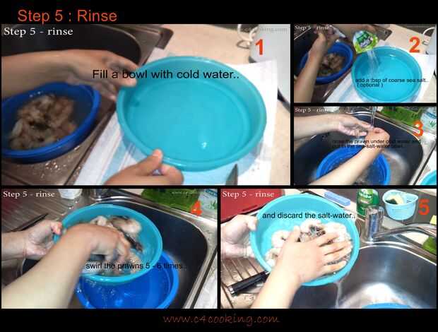 • las gambas del remolino en tazón de fuente de agua de sal de mar 5 - 6 veces y desechar el agua salada