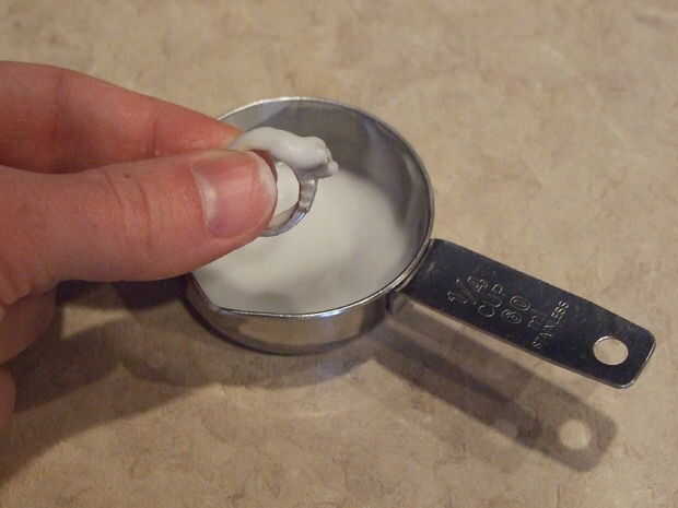 Mezcle una pequeña cantidad de bicarbonato de sodio y agua en la taza de medir pequeña. Debe ser sobre la consistencia de la pasta de dientes descafeinada.