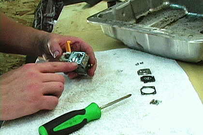 Punta! Carburadores tienen muchas piezas pequeñas. Carburador partes organizadas en el orden en que se hayan retirado (como en filas) para hacer el montaje rápido y preciso.