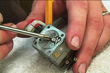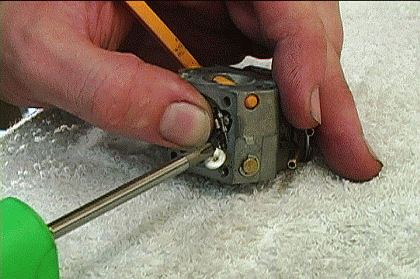 Desenroscar el tornillo para soltar el mecanismo del cuerpo del carburador de retención de la válvula de aguja.