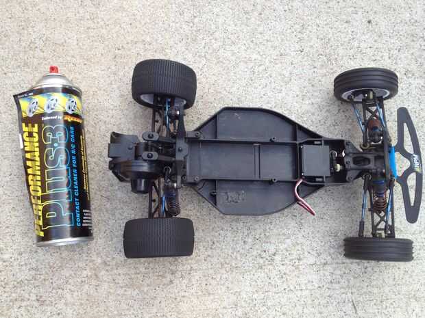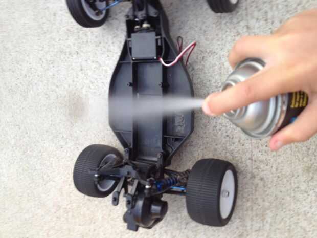 1. salir en un área bien ventilada y cubrir ambos lados del coche RC con el aerosol motor RC.