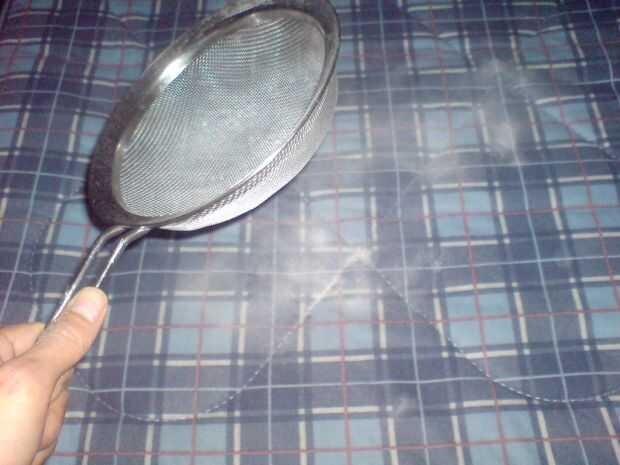Si está usando un colador, vierta una pequeña cantidad de bicarbonato de sodio en el tamiz y utilice el tamiz para asperjar la soda por todo el colchón. Usted está apuntando para un buen polvo sobre toda la superficie del colchón para que no te preocupes demasiado mucho si accidentalmente coloca demasiado, sólo difundirla alrededor.