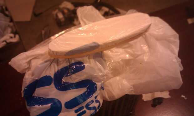 De pie el intercooler en un extremo. Coge una de las bolsas de plástico y extenderlo plano, debería ser 2 capas gruesas por todas partes. Doble ahora por lo menos una vez, dependiendo del tamaño de la abertura a sellar. El área de estanqueidad necesita ser no sólo tan grande como la apertura pero cuelgue sobre el borde suficiente para que el la banda de goma para sostenerlo. Que es el siguiente paso. Coloque la bolsa doblada en la abertura y estire la banda de goma alrededor de él. Tenga cuidado de hacer que las arrugas en el plástico debajo de la banda, saque cualquier arrugas que forman.