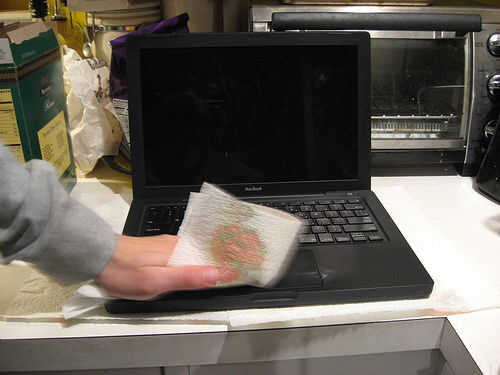 Esta es la parte más difícil, usted no puede conseguir agua en la grieta alrededor de la almohadilla o se trabe mucho. Limpiar restos de la palma, el teclado (solo las teclas, no escurra el agua debajo de las teclas. luego limpio el bisel alrededor de la pantalla con agua, como el jabón tiene el potencial de dañar la pantalla. por último, limpie la almohadilla y el botón del ratón con una tonelada de jabón, esto es donde la mayor parte de su dedo grasa extremos para arriba.