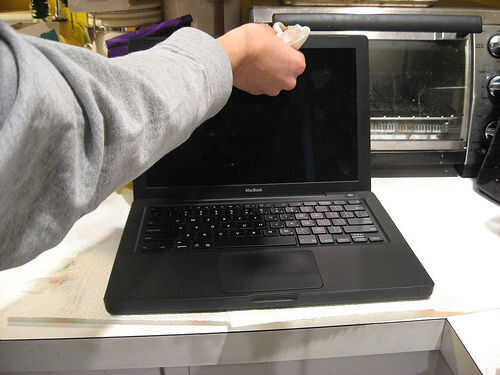Lo que usted necesita:-Ordenador portátil que está en desesperada necesidad de cierto color-Pintura en aerosol Montana, color de elección.-Toallas de papel-Pinzas-Cinta de pintorPaso 1: Limpiar.Limpiar tu portátil, haz toda la grasa de lo contrario q
