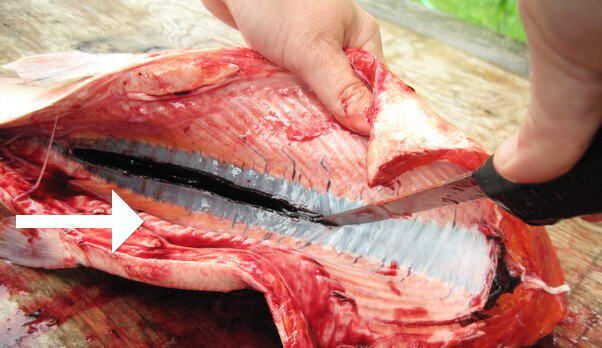 Corte a lo largo de la parte interior para revelar la línea de sangre.