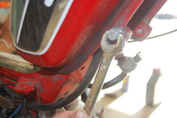 Desenroscar de los tuercas y tornillos sosteniendo el tanque de gas del ciclomotor.