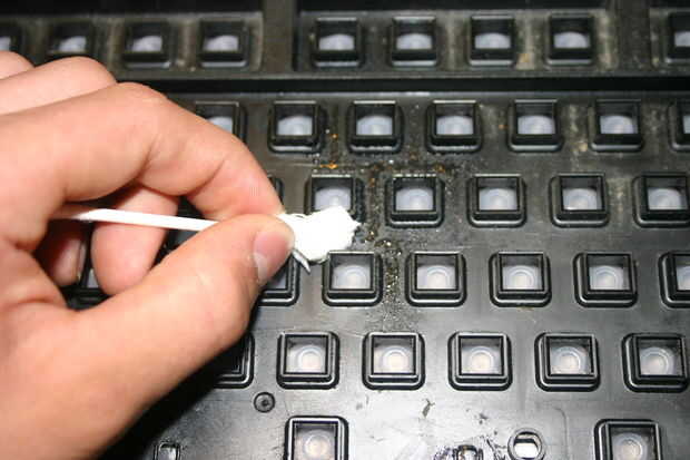 El pozo es el área debajo de las teclas. Puede atrapar cualquier cosa, desde polvo a pedacitos de metal para enfermedades exóticas. Necesita una limpieza exhaustiva. Doblar un pañuelo de papel en una pequeña plaza y ejecute el borde entre los hoyos de llave después de rociar Windex en las áreas muy sucias. Usé un regado mezcla de Windex por que mi tierra no muy molido en. Hay una especie de suciedad pegajosa que algunos teclados que necesita una gran cantidad de Windex / frotar alcohol para bajar. La fuerza puede con usted si tiene.