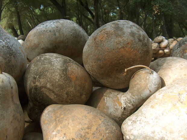 Jícaras, que son variedades de cucurbitáceas (familia del pepino) crecen con una piel verde cerosa. La cáscara sí mismo es endurecida al secado en el campo, que puede tomar semanas o meses. La piel cerosa marchita, se seca y vuelve marrón/gris oscuro que ves en las fotos de las calabazas intactas. El bronceado más ligero que puedes ver está la cáscara dura se expone cuando se quita la piel cerosa.