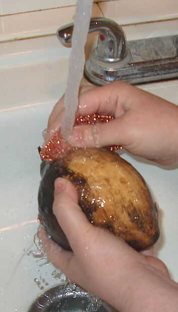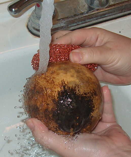 Lo que tengo es una foto de una calabaza que no necesitaba mucho remojo y le fue bien con apenas algo de agua caliente y una esponja de cobre. Puedes ver no estaba con guantes, que era una mala idea, porque mis uñas mojados se han podido purgar. Yuck. Guantes.