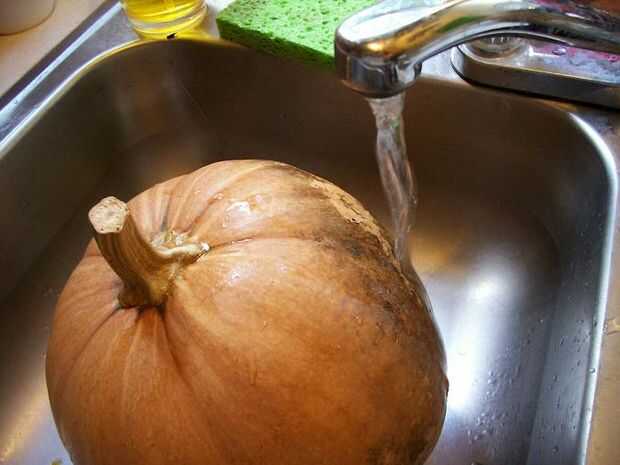 Da la calabaza un poco baño. No es necesario jabón, pero quiere sacar toda la suciedad suelta y verifique las zonas suave/blando/podrido. Si encuentras áreas de maldad, tome un momento para cortar lejos con un cuchillo de mano. No hagas daño a ti mismo - cuchillos tienden a ser agudos. Si el cuchillo no afilado, afilar primero - cuchillas desafiladas tienen más probabilidades de lastimarte porque ellos no están funcionando correctamente.