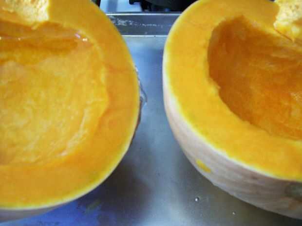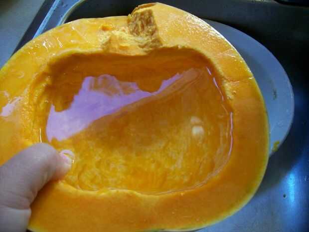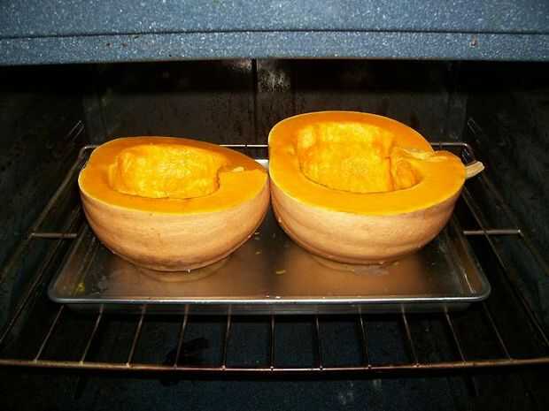 Vierta el agua de la calabaza en la cacerola. Coloque la mitad de agua junto a sus parientes y coloque con cuidado la bandeja en el horno. Trate de no derramar el agua.