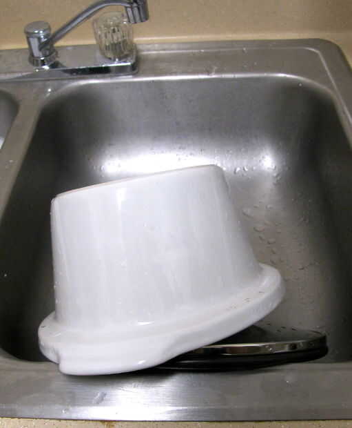 Imagen 4: Dejar de lado que se seque. (En muchos casos puede no haber espacio suficiente en el plato de secador para colocar los dispositivos de cocción, en este punto usted puede poner los aparatos de cocción en el fregadero donde se han lavado los platos. Después de todos los platos se limpian no necesita este espacio ya.)