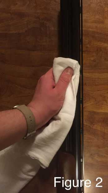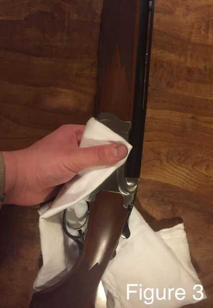 3. Limpie los barriles del arma, la acción y cualquier otro metal expuesto con el trapo grande desde el paso 1, quitando cualesquiera aceites de la piel y dejando una fina capa de aceite (figuras 2 y 3) la limpieza del arma.