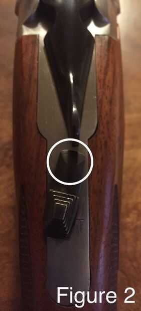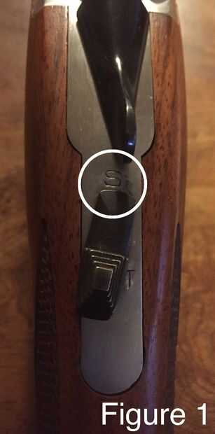 Nota: El interruptor de seguridad se encuentra en la parte superior de la acción y debe siempre estar en la posición hacia abajo cuando no ser despedido. La "S" encima del interruptor de seguridad debe ser visible cuando el mecanismo de seguridad esté activado (ver figuras 1 y 2).