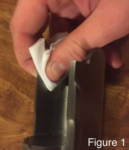 2. Limpie el interior de la acción con la pistola de limpieza trapo, quitando cualquier residuo negro (Figura 1).
