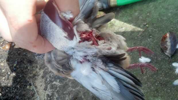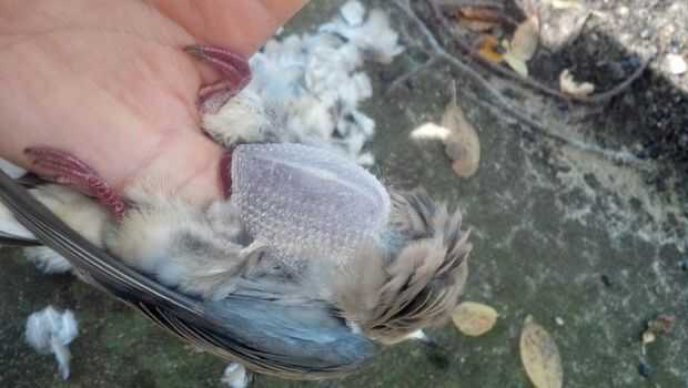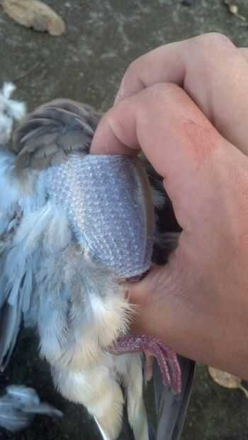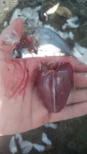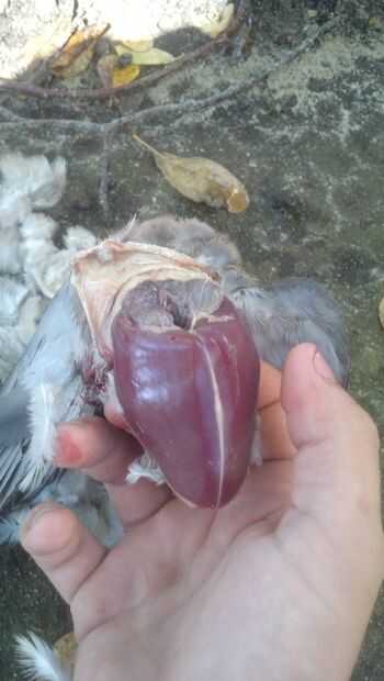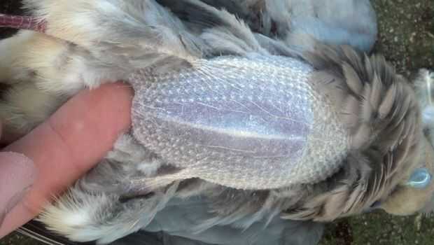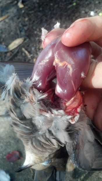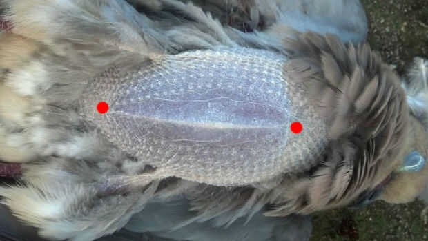 Espera el pájaro en la mano en él con la cabeza a los dedos y la cola en su muñeca. Identificar los dos extremos del hueso del pecho y marcada por los puntos rojos en la imagen de arriba. Coloque su dedo pulgar en la parte final del hueso del pecho y presione firmemente hasta que salte a través a la cavidad del cuerpo. Empuje el pulgar todo el camino hasta llegar al otro extremo del hueso del pecho.