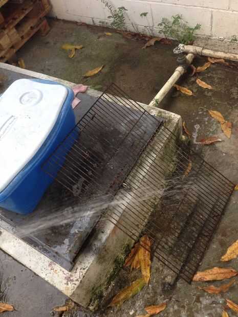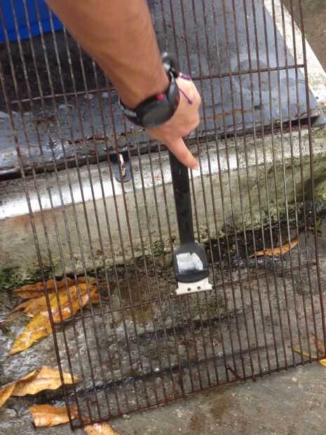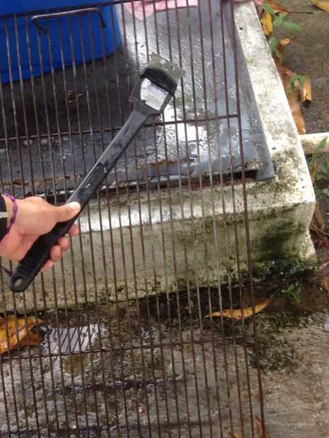 En este paso cuántos la manguera y el cepillo simultáneamente, para cepillar y quitar todo residuo de carnes o carbón quede en la parrilla, le echamos agua para el sucio se debilite y vaya callendo.
