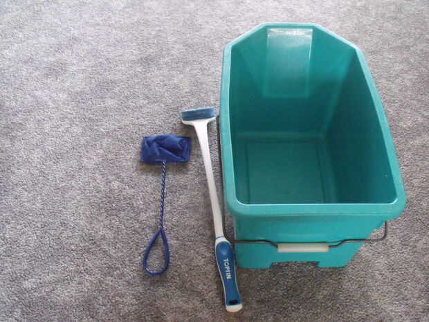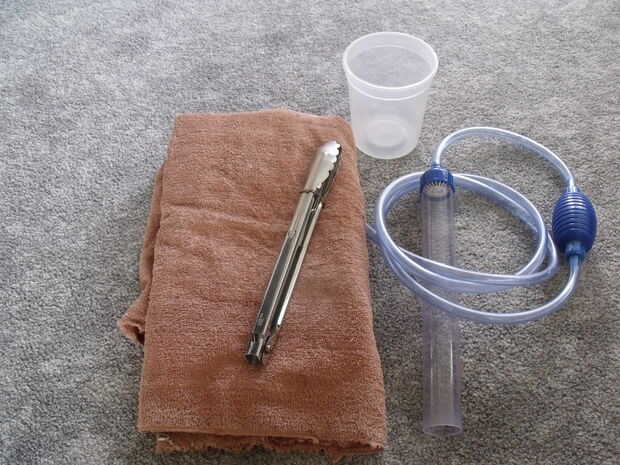 Son: pinzas de ensalada, una toalla, un contenedor, una red, una esponja, un cubo, agua (no ilustrado) y un vacío el tanque