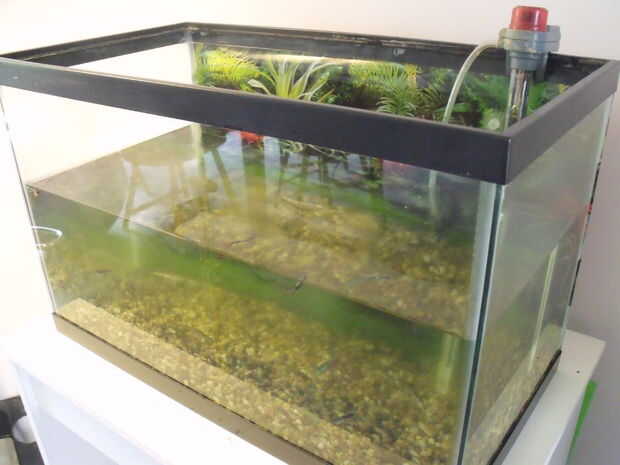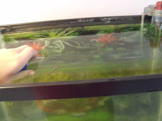 Ponga el otro extremo en el cubo y bomba de agua usando la bomba de mano. Empezar a aspirar la grava empujando aspirar terminar en la grava y luego levántelo hasta que ha vaciado la grava en el extremo de succión. Repita esto, moverse por el acuario entero. Chupar hasta que el tanque está vacío a medio camino. ¿O medio lleno?