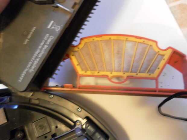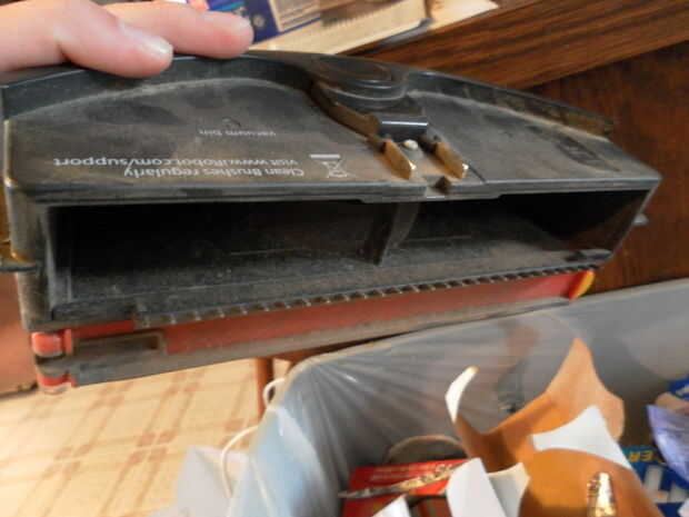 Primero quitar el cubo de la basura y vaciar cualquier resto de suciedad en su interior. En segundo lugar saque el cajón de filtro tirando el tab(see photo) amarillo y luego vaciar de la suciedad en el interior. Por último cierre la puerta del filtro y vuelva a colocar el cubo de la basura a la Roomba.